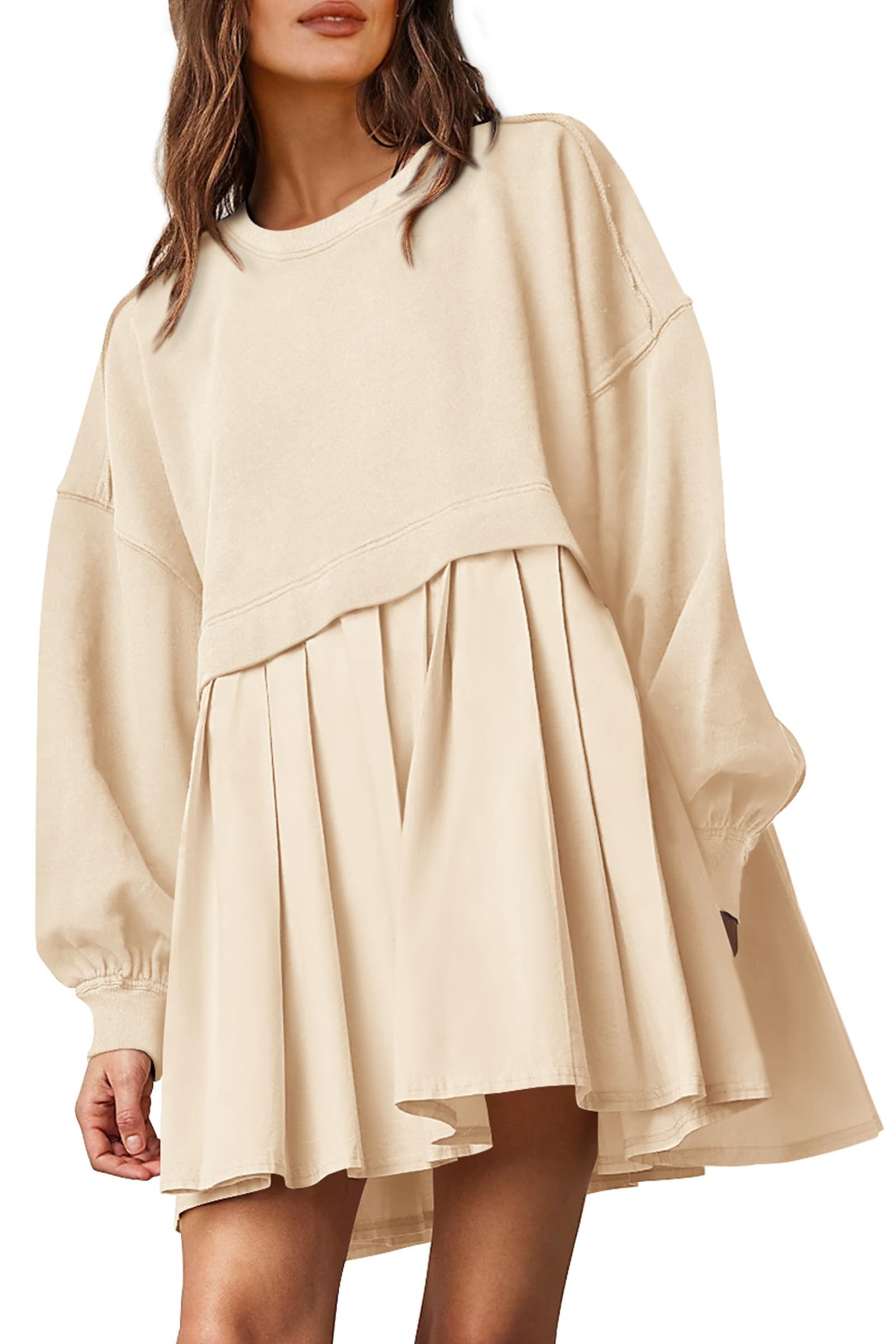 Our sweatshirt dress is designed with round neckline, drop shoulder, long puff sleeve, gathered cuffs, pleated bottom, flowy hem, patchwork details, solid color. Suitable for casual daily wear, lounge wear, party, club, street, dating, going out, vacation, holiday, weekend, or tennis, golf, workout, etc.